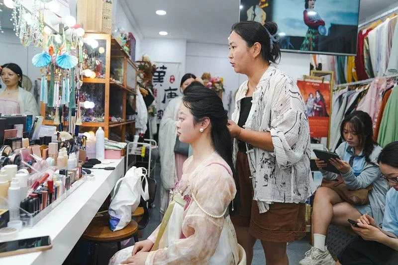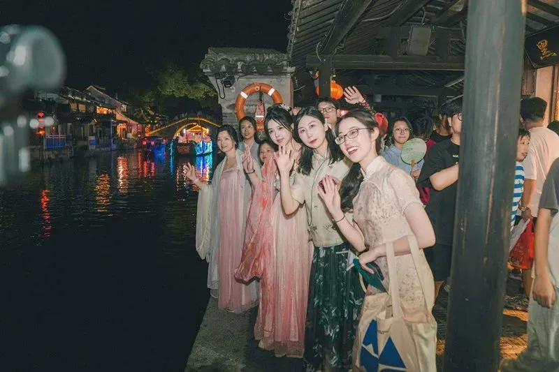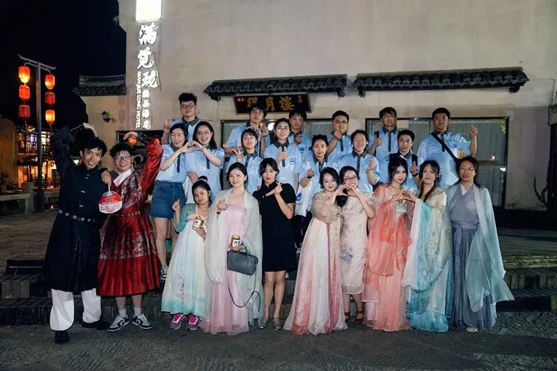 留学人员梦夜游古镇西塘,体验汉服文化。