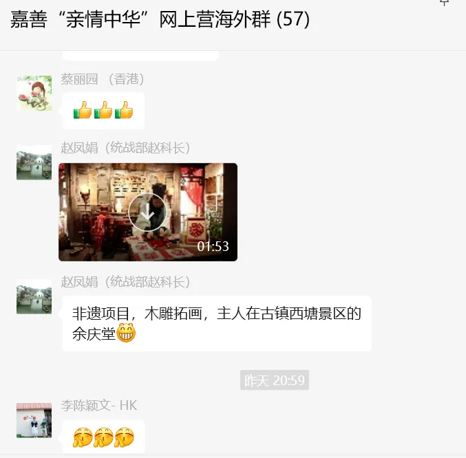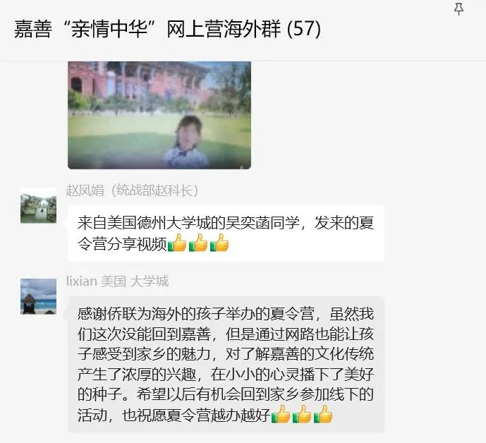 在“亲情中华·诗意水乡”网上营嘉兴·嘉善营,县侨联委员、留学东京大学博士的章蓉,嘉善县留联会副会长、美国留学的包叶红受邀担任班主任。海外华裔青少年们通过微信群观看了传统文化讲座视频,体验了盘扣等非遗文化手工制作,纷纷在群内发布视频、文字积极互动,畅谈活动感想。